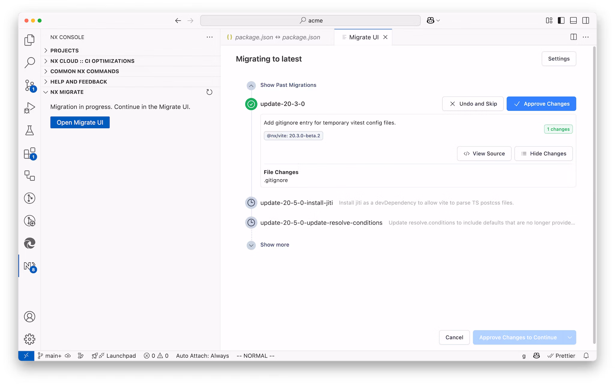 Once you start the migration, Nx Console runs the nx migrate command to update your dependency versions and generate a migrations.json file. You'll be prompted to inspect the changes made to your package.json before installing them and proceeding.